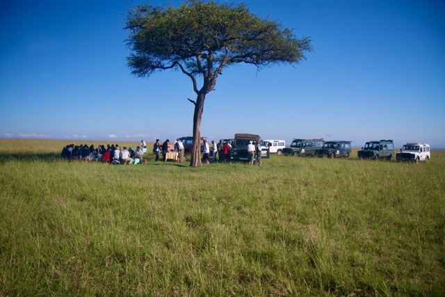 If you remember I told you Kenya was not picturesque, well I lied. The sheer majestic beauty of the countryside, a lone tree on the skyline surrounds the savannah of tall yellow grass is picture book perfect. We arrive at our outdoor breakfast spot under a large tree with nothing but nothing as far as the eye can see. Normally I wouldn't gush about a toilet but this has to be one of the created places on earth to go for a pee. A windbreak some 30 feet away, you sit on the bowl and look out over mile upon mile of grass and deep blue sky and for a moment you feel like your the only person on the planet.